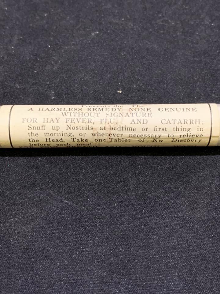 The small vial of white powder is “Matt J. Johnson’s Hay Fever, Catarrh, and Flu Remedy.” Catarrh is the excessive buildup and/or excretion of mucus in the nostrils and throat. Johnson worked out of Eau Claire, WI. This powder was meant to be sniffed to help alleviate symptoms. It could also be dissolved in warm water to be used as a mouthwash to cure foul breath.