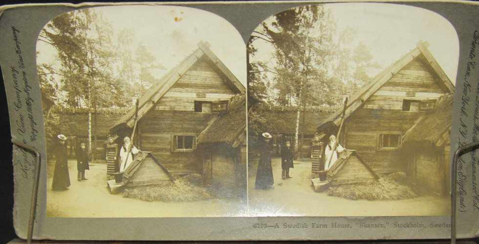 Stereoscopes were the precursor to view finders. They use two of the same images to create a 3-D effect when looking through the viewing lenses. This particular stereoscope was made in 1905 and has an image of a Swedish farm house. The viewing lens house is decorated with tin that has a floral pattern etched into it. Velvet was used to trim the lens house to make it more comfortable when it is put up to the eyes.